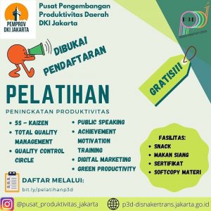 Pelatihan Peningkatan Produktivitas, Pengukuran Produktivitas dan Bimbingan Konsultasi Peningkatan Produktivitas GRATIS !!. Peserta mendapat program gratis dan makan siang serta dipandu oleh Trainer dan Instruktur yang berpengalaman.